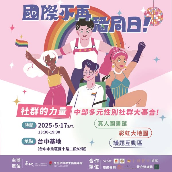 在今年5月17日國際不再恐同日這天,我們結合國際LGBTI 聯合會(ILGA World)所訂定的主題「社群的力量」(The power of communities),將於基地舉辦「中部多元性別社群大基合!」系列活動:真人圖書館:邀請多位與談人分享中部同志文化,一起chill聊歷史、說故事、彩虹大地圖:由社群伙伴和基地共同製作的彩虹大地圖,每位來訪朋友都能寫上自己推薦的店家、餐廳、組織或單位等,讓資訊持續傳遞、議題互動區:體驗基地自製的各項創意宣導行動,不僅可以玩、還能拿取小禮物,並從中認識更多的性別平等概念。