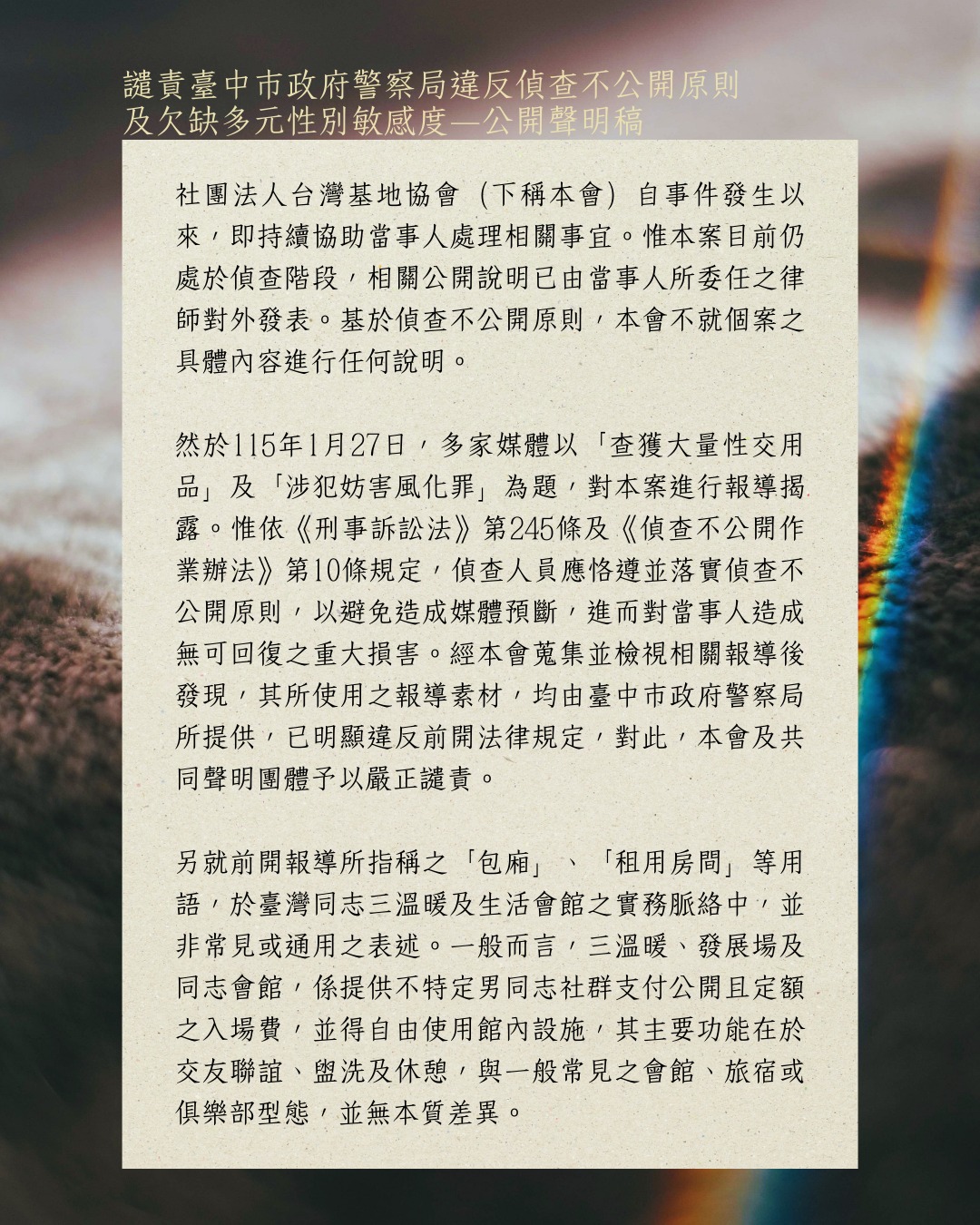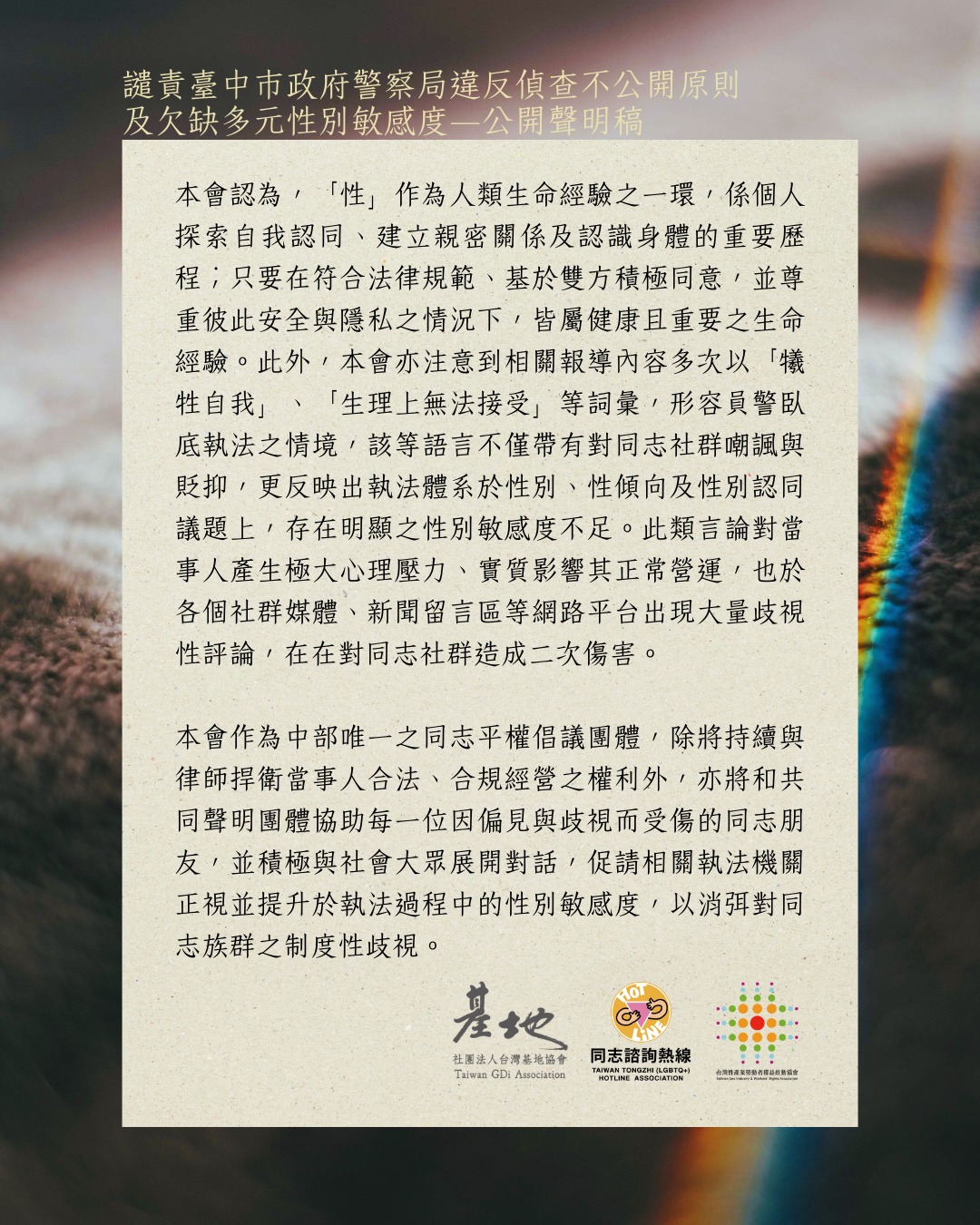 公開發聲 2026-01-29 聲明稿:譴責臺中市政府警察局違反偵查不公開原則及欠缺多元性別敏感度—公開聲明稿 聲明發起單位:社團法人台灣基地協會共同聲明團體:社團法人台灣同志諮詢熱線協會、社團法人台灣性產業勞動者權益推動協會1/27(二)21:30後,新增共同聲明團體:社團法人台灣性別平等教育協會、財團法人民間司法改革基金會、社團法人台灣愛之希望協會、陽光酷兒中心、南方彩虹街6號、社團法人臺中市好民文化行動協會。 相關連結 原文連結