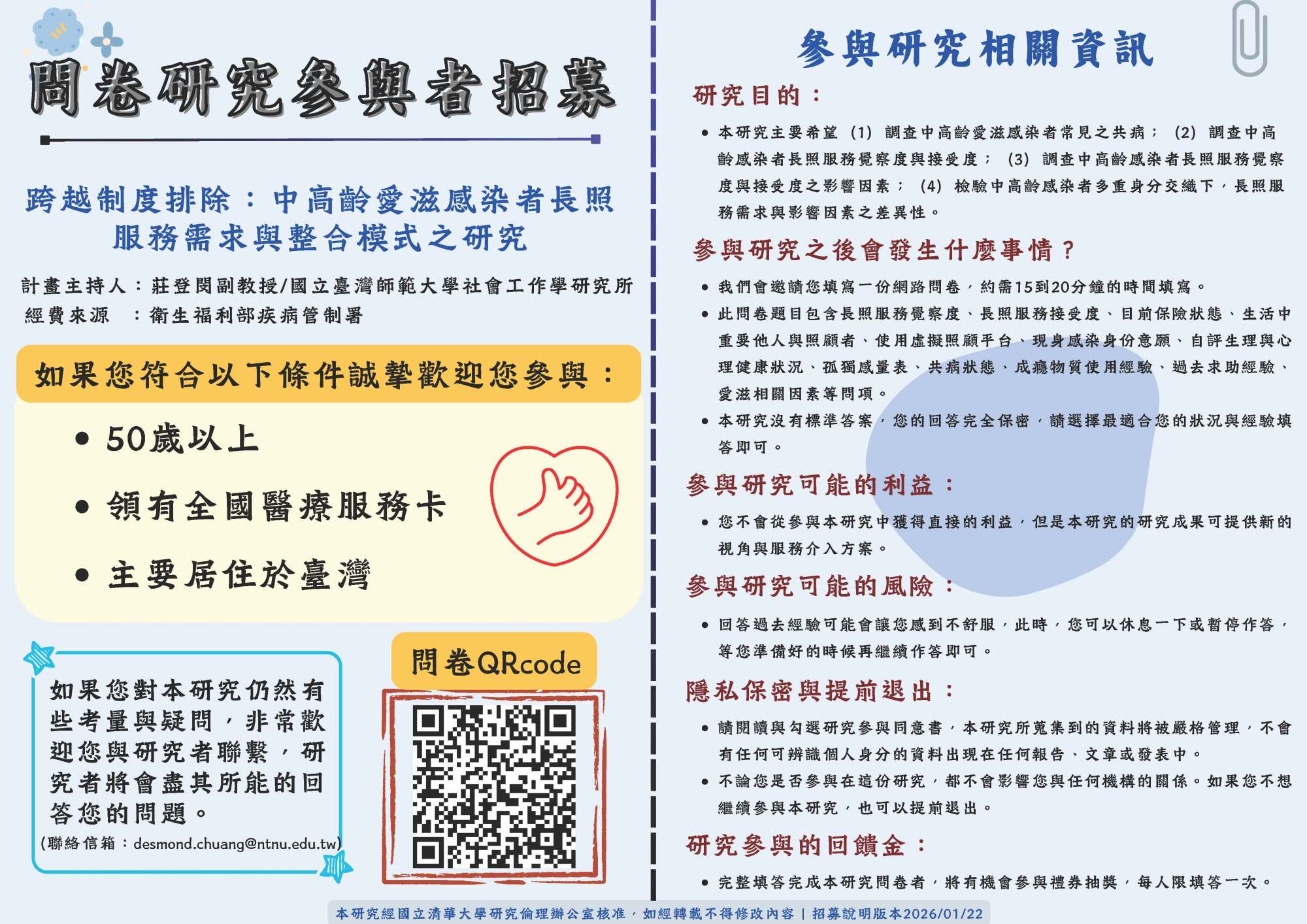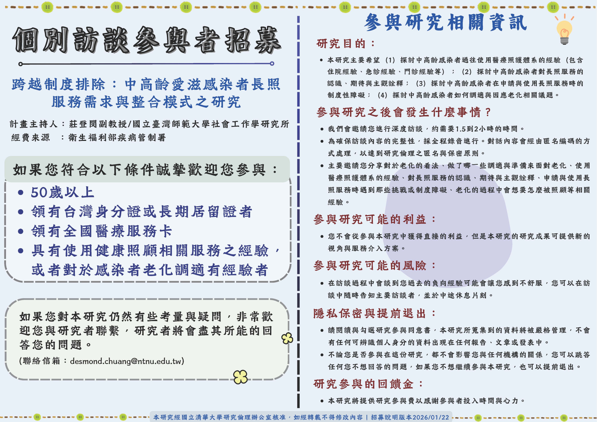 - 個別訪談:符合50歲以上、領有台灣身分證或長期居留證者、領有全國醫療服務卡、具有使用健康照顧相關服務之經驗或對於感染者老化調適有經驗者,即符合本案訪談對象。歡迎有意願接受訪談的朋友,請直接聯繫莊登閔副教授desmond.chuang@ntnu.edu.tw