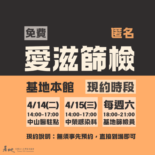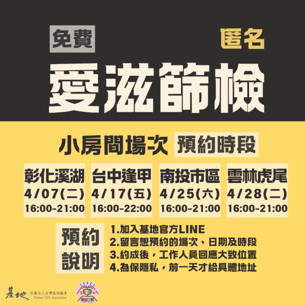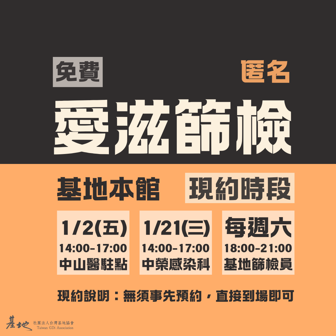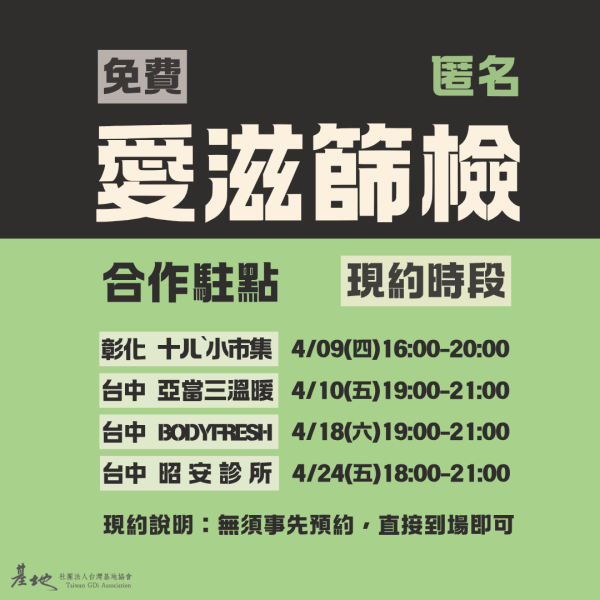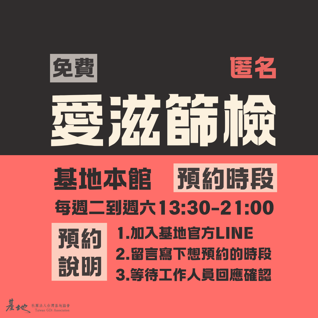 基地每月和不同店家合作、亦會至特定場域提供免費匿名篩檢服務。無須預約,直接前往即可。歡迎加入基地LINE官方帳號以追蹤最新訊息喔!