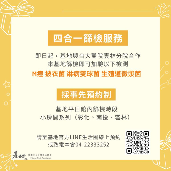 基地與台大醫院雲林分院合作,即日起,來到基地除了原先的篩檢項目,還可以免費加驗以下四種檢測:M痘、披衣菌、淋病雙球菌、生殖道黴漿菌。