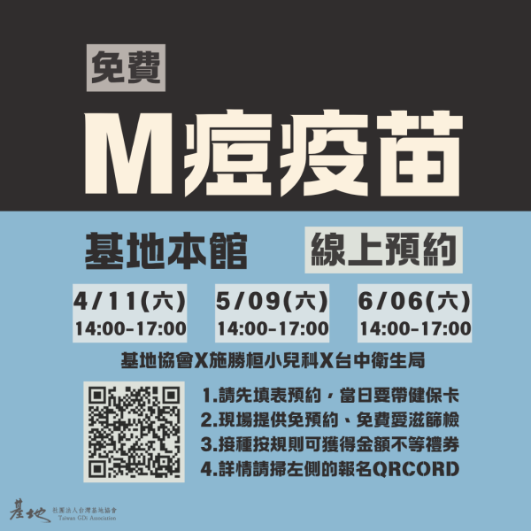 基地與臺中市政府衛生局、施勝桓小兒科診所共同合作,每個月於基地場館提供公費(免費)M痘疫苗接種服務;此外,亦和南投縣政府衛生局合作外展場次。無論於基地本館或外展場次,若搭配愛滋匿名篩檢皆能獲得50元至300元不等的便利商店禮券,歡迎前往公費M痘疫苗接種表單預約。