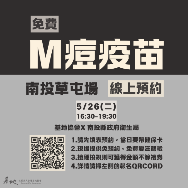 Additionally, in collaboration with the Taichung City Health Bureau, the Nantou County Health Bureau, and Shih Sheng-Huan Pediatric Clinic, Taiwan Gdi hosts regular monthly "Publicly Funded Mpox Vaccine" stations (available to foreign nationals). Not only is the vaccination free of charge, but participants can also receive gift vouchers ranging from 50 TWD to 300 TWD.